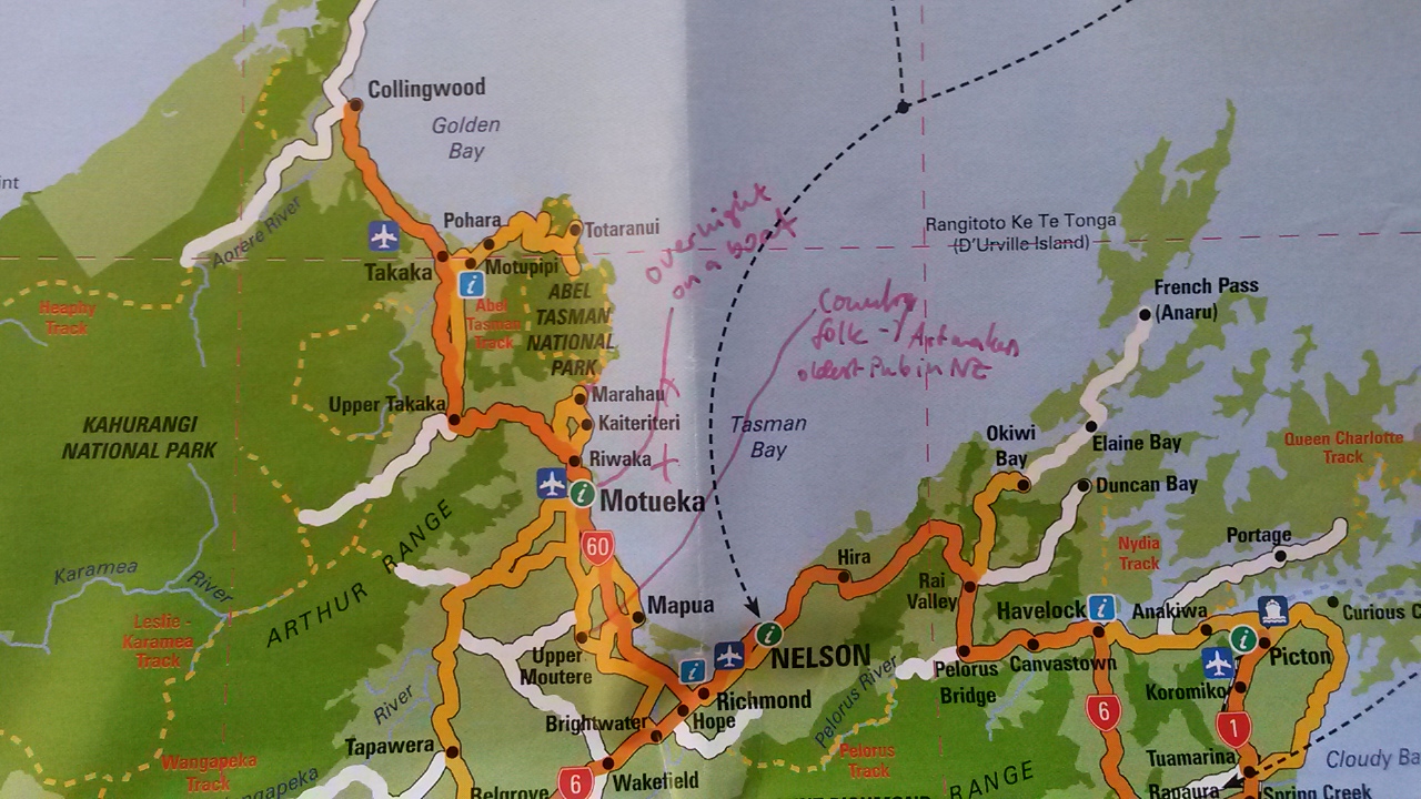 Hier auf der “großen” Karte unten seht Ihr Nelson so ziemlich in der Mitte. Wir fahren morgen mit dem Bus von hier nach Kaiteriteri.