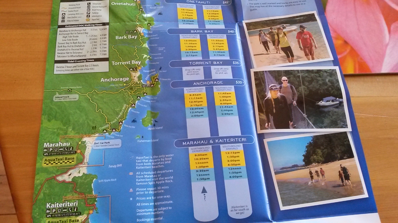 Auf der Karte oben geht es mit dem Boot von Kaiteriteri nach Onetahuti, vorbei an einer Seal colony (Robbenkolonie) an der Tonga Island. In Onetahuti steigen wir aus und wandern durch den Regenwald nach Bark Bay (ca. 2h) und springen ins kühle Nass. Von Bark Bay nehmen wir wieder das Boot nach Kaiteriteri und von dort geht es mit dem Bus zurück nach Nelson.